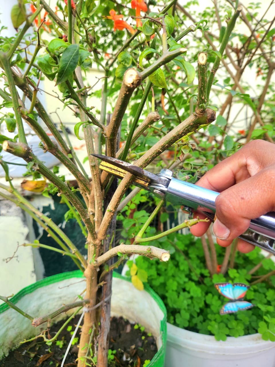 हार्ड प्रूनिंग क्या है? हार्ड प्रूनिंग में, हम पौधे का एक बड़ा हिस्सा काट देते हैं – जिसमें मोटे तने और बड़ी टहनियाँ शामिल होती हैं।