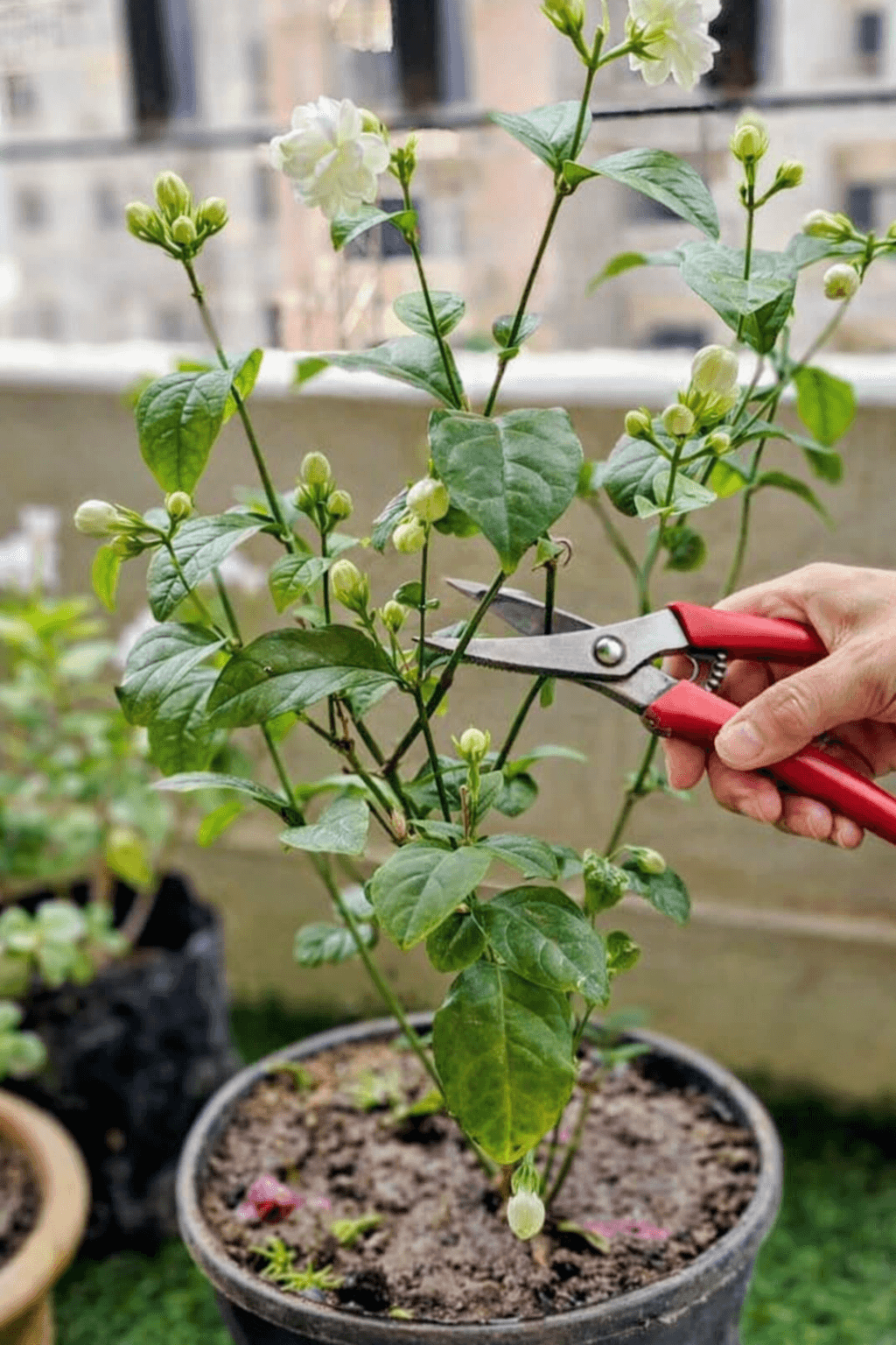 पुरानी और सूखी टहनियां, पतियाँ हटाने से मोगरा में नई ग्रोथ तेज़ होती है और ज़्यादा फूल आते हैं।